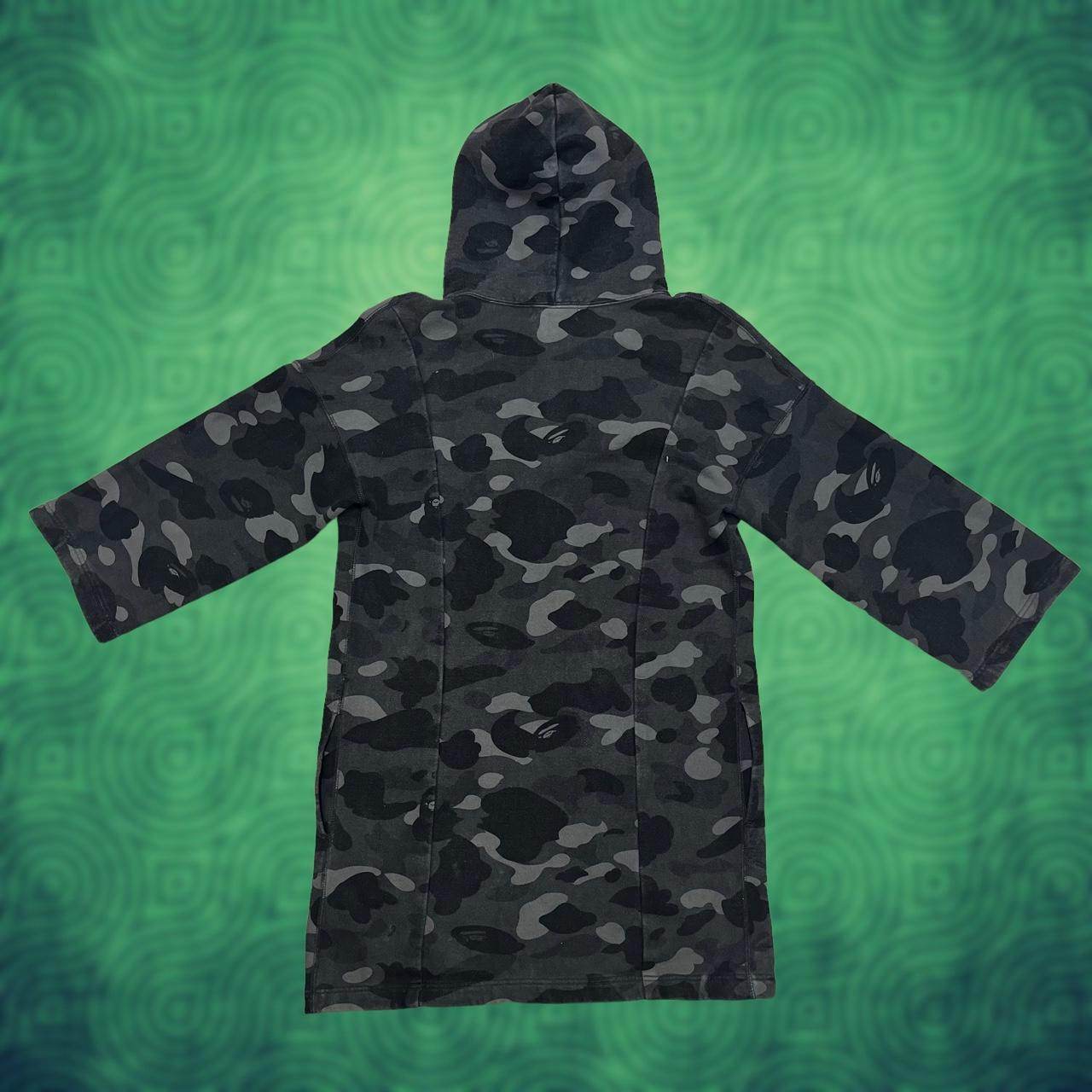Bape hoodie with black and grey camo pattern, long bottom and short sleeves and bape print on the hood