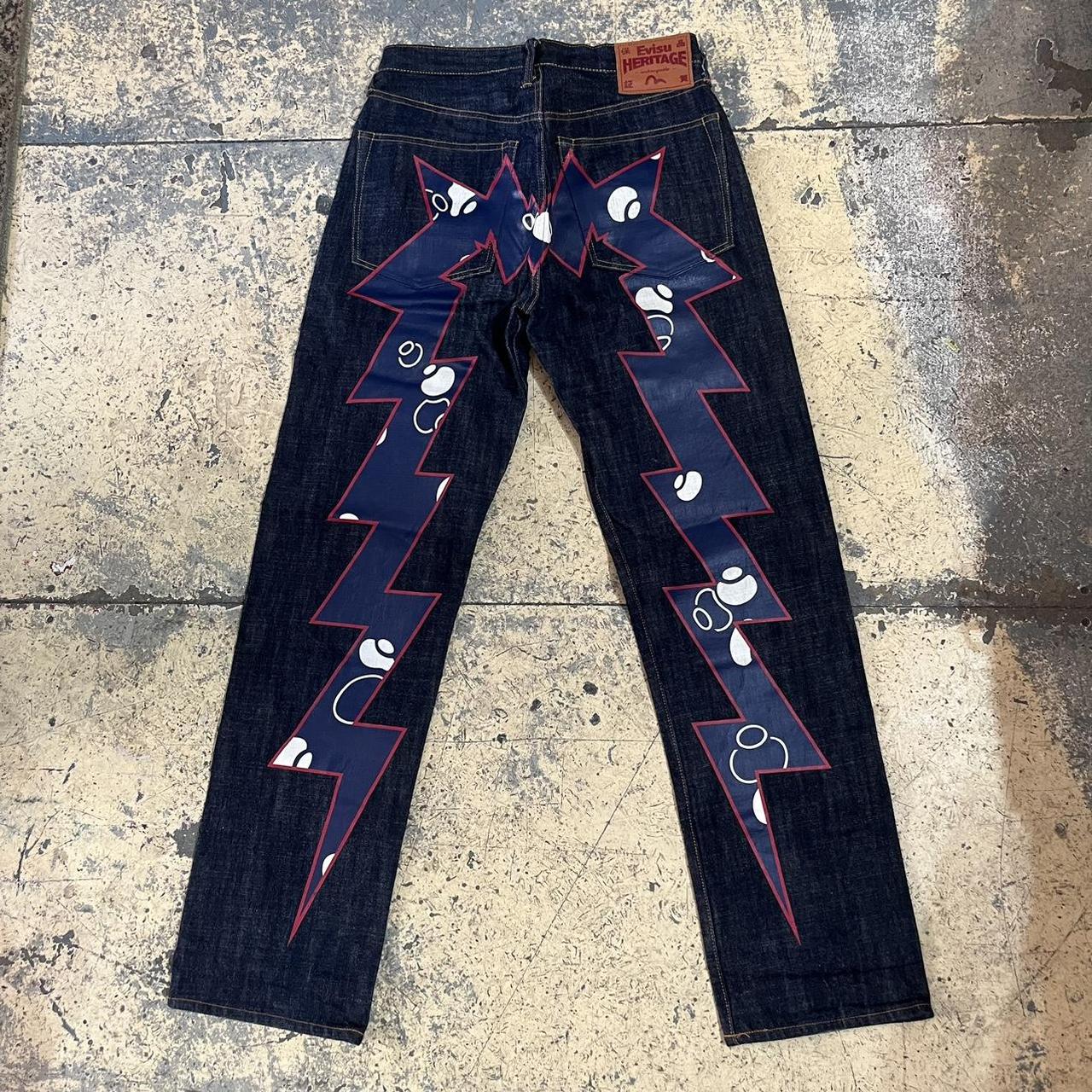 Evisu selvedge denim jeans with lightning daicock print on the back