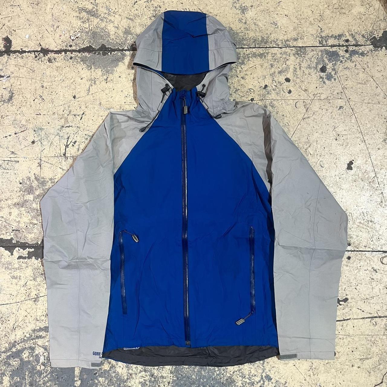 Blue and grey Salomon goretex jacket with Salomon print on the front arm and back