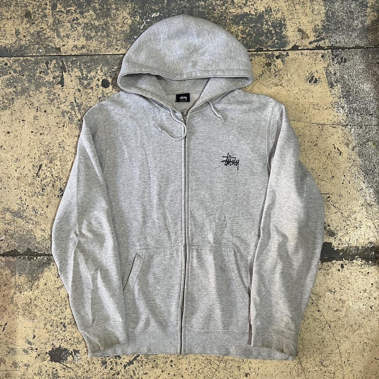 Grey stussy zip up hoodie with black spellout print on the front and back