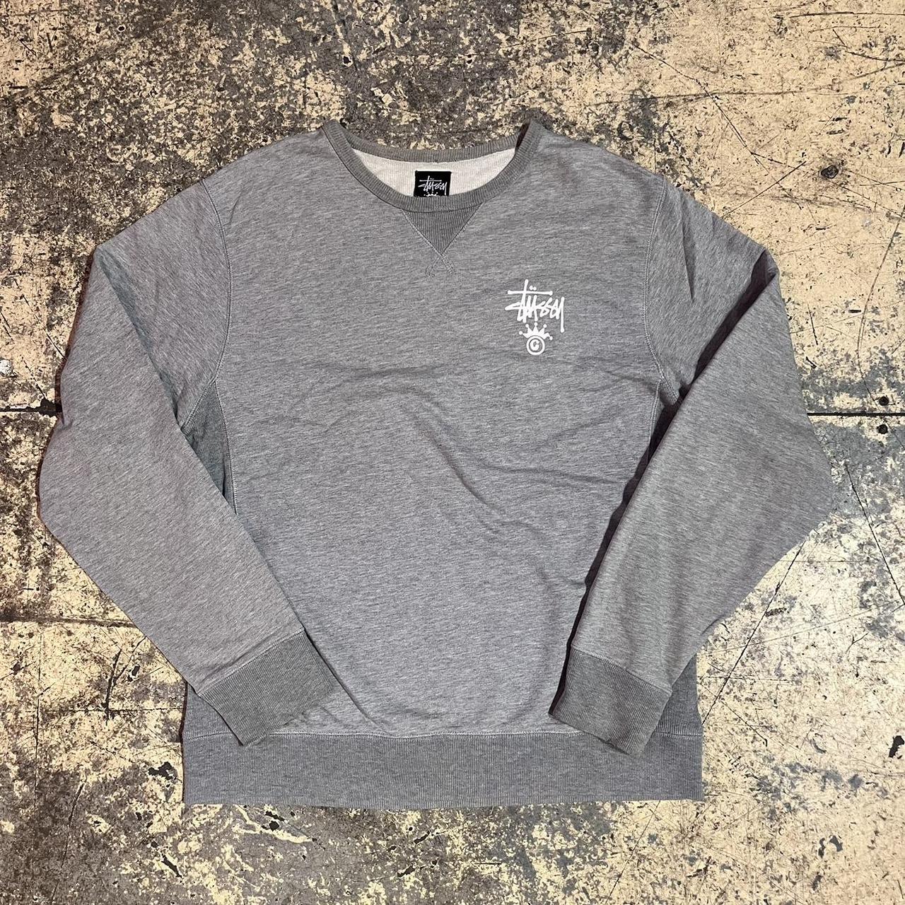 Grey stussy crewneck jumper with white logo on the chest