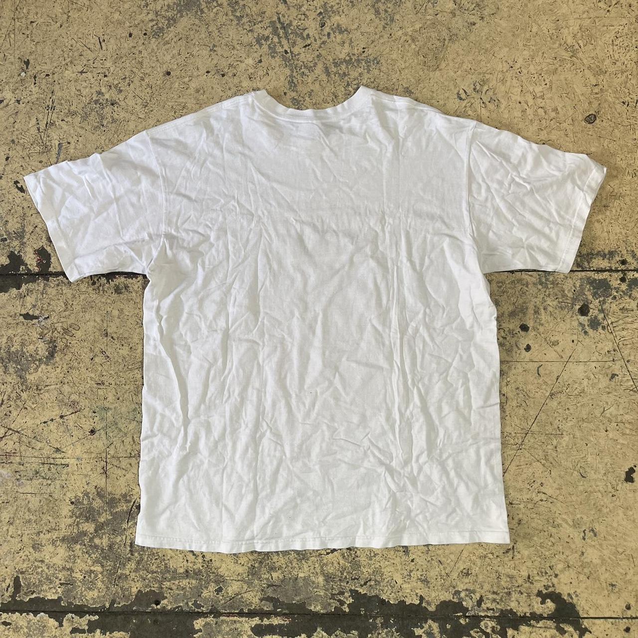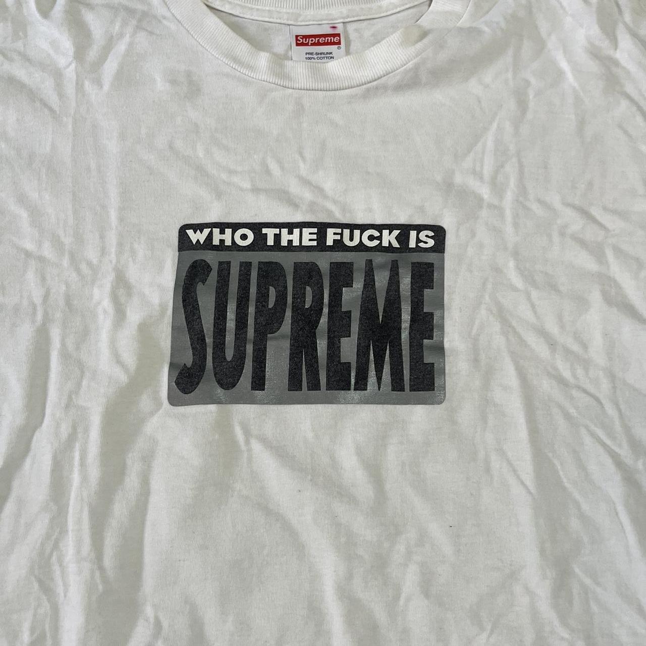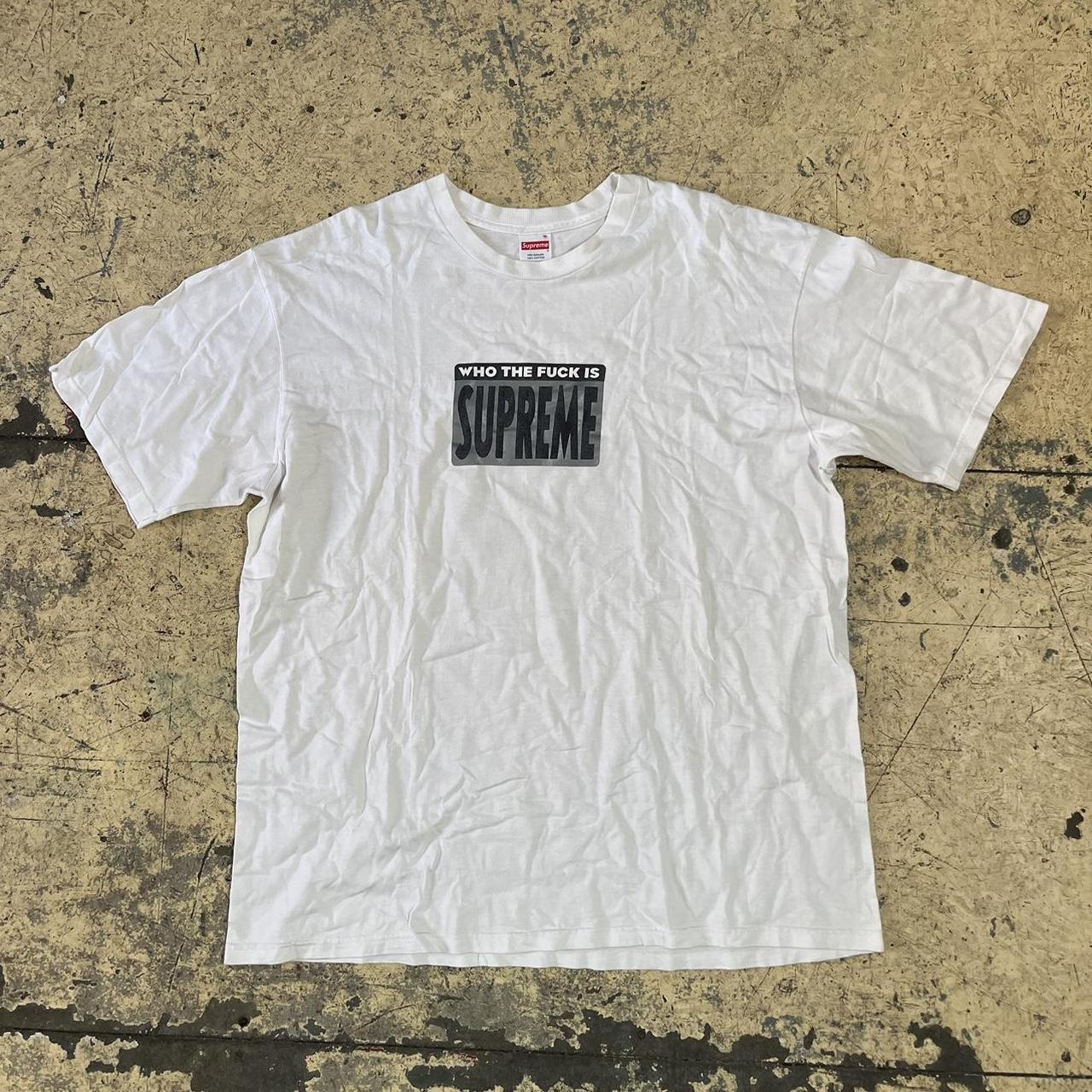 White supreme t shirt with who the f is supreme print on the front